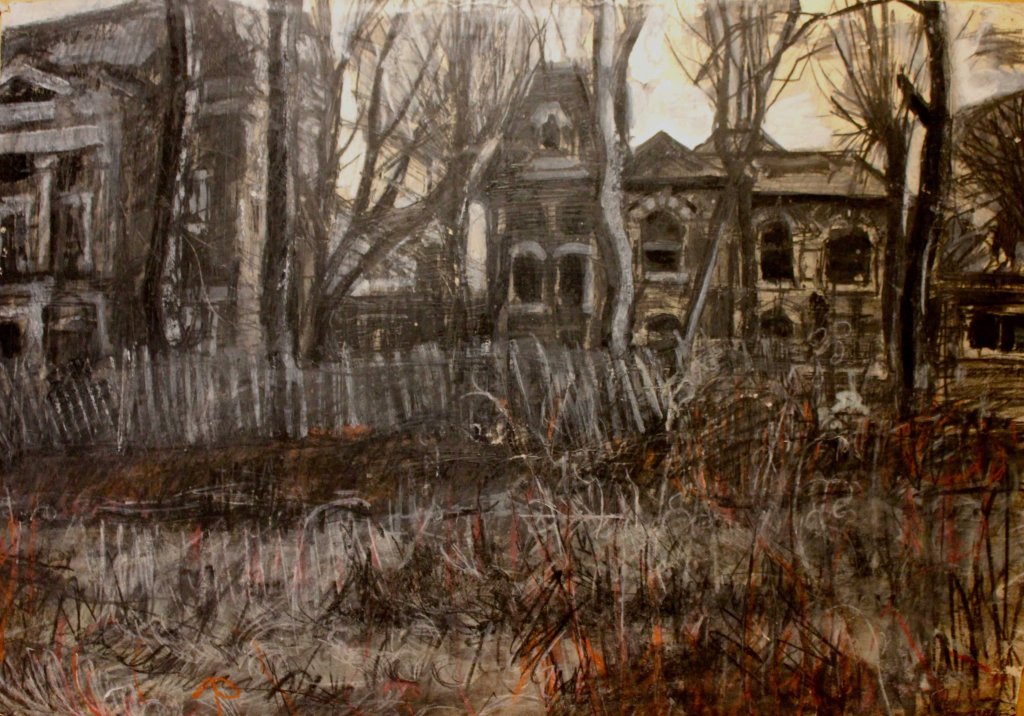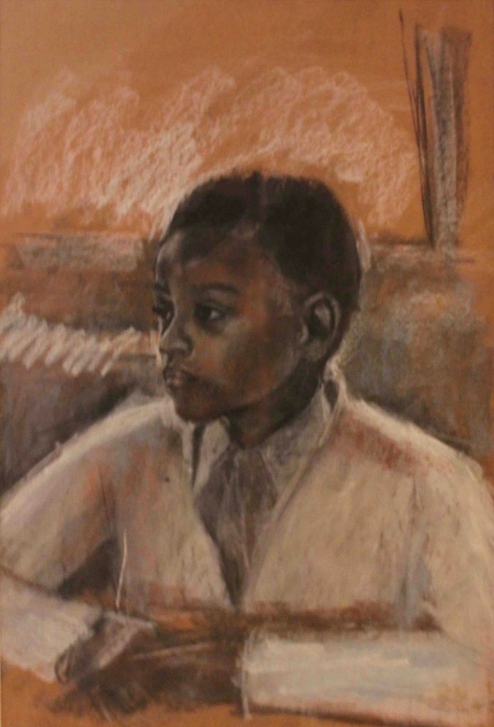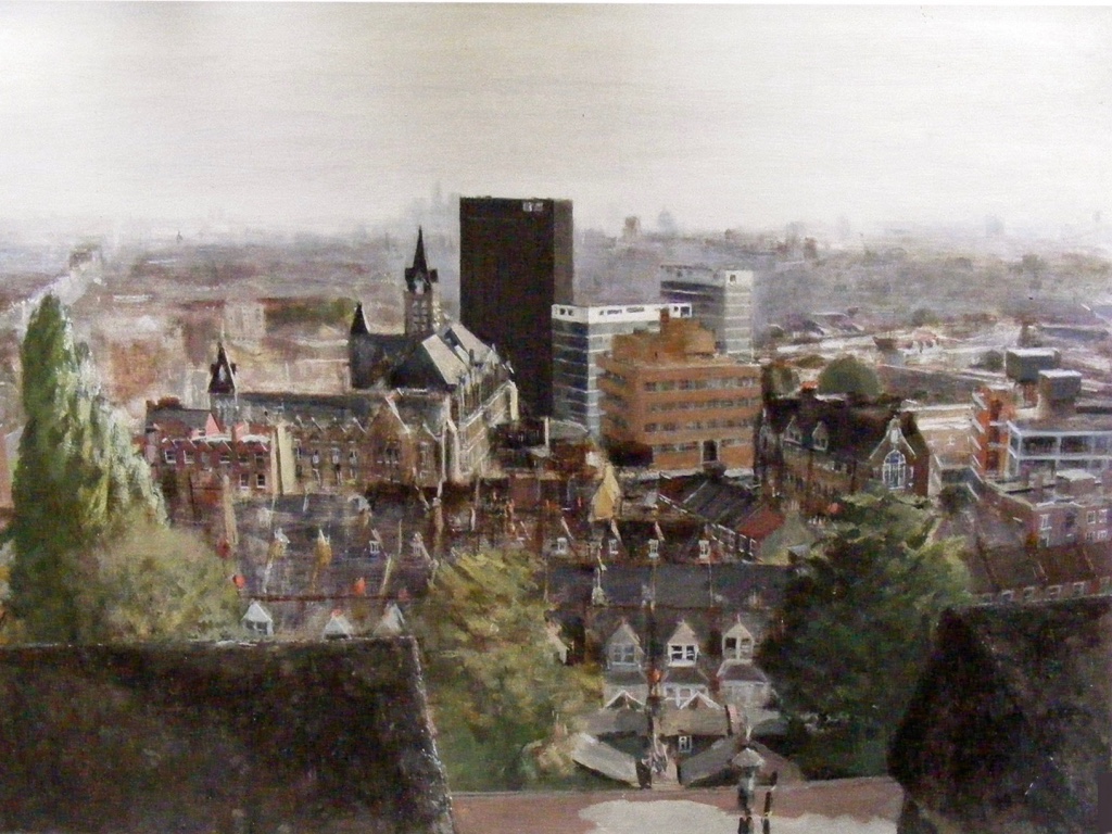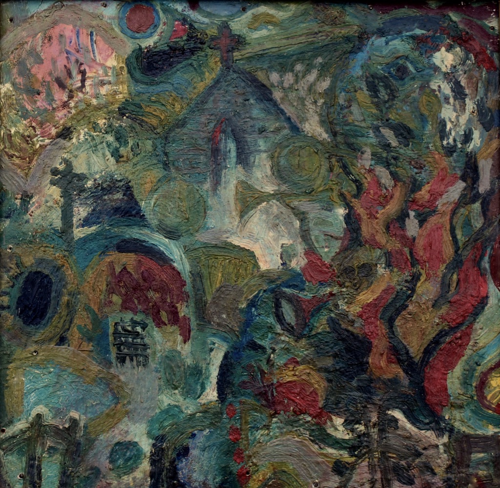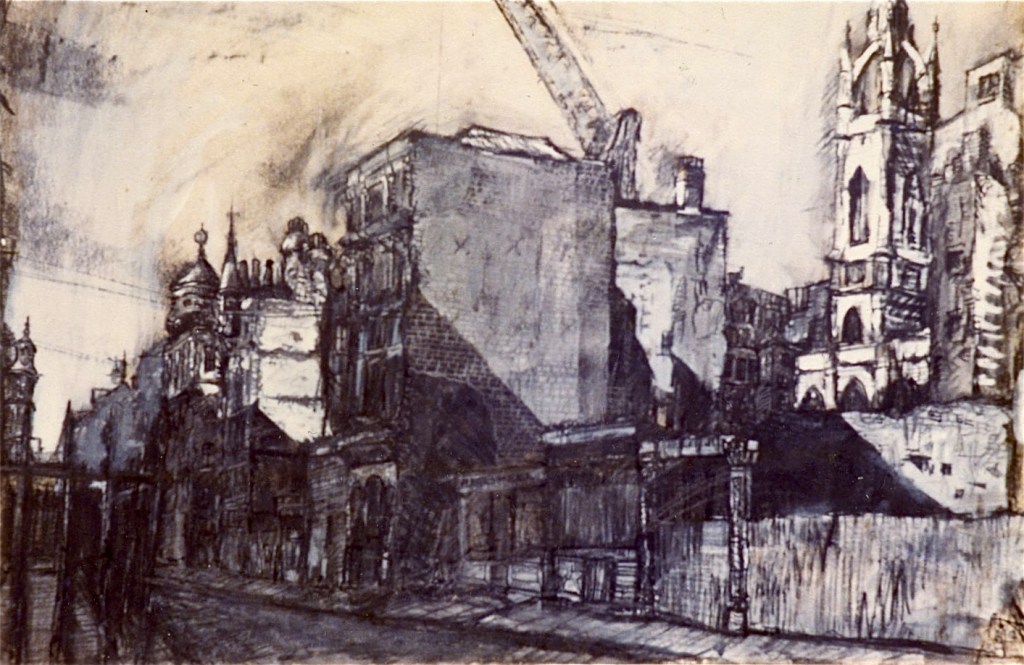 Outdoor drawings: Billingsgate, with the tower of St. Dunstan’s Church; the industrial design annex of Hornsey art college; lino-cut: The Prodigal Son; collages: Cuba Missile Crisis and ‘Garden Wall’; stained glass from fragments, 1960-61