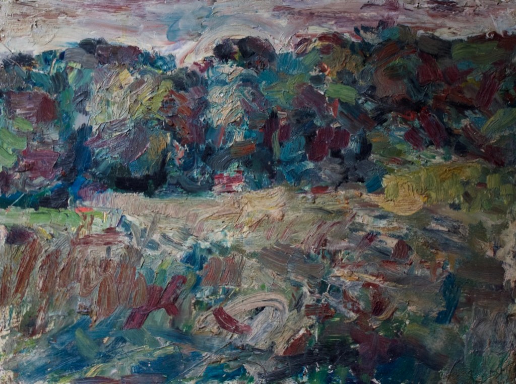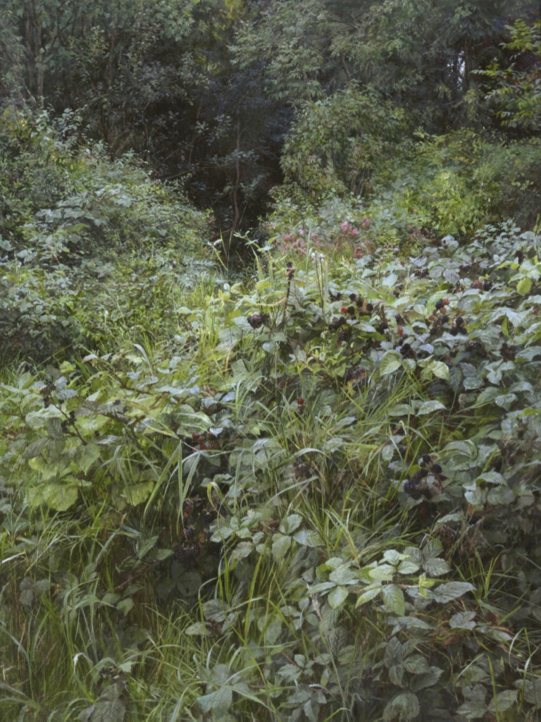 ‘Blackberries in August’ took four weeks of painting daily on site. As the painting developed, the brambles in the foreground grew apace, and were incorporated with other changing aspects of the scene as the summer advanced. The painting was acquired by the Greater London Council in 1980, and is on permanent display at the Guildhall Gallery, London.