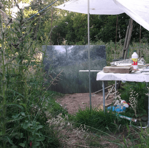 I look for a neglected or semi-wild corner of a private estate or garden – always in negotiation with its owners. I want to paint a community of wild plants and present them centre-stage with the human world modestly in the background. I start with the most distant features and gradually work towards the foreground, painting overlaid lattices of vegetation, and tracing a journey through time as well as space, so that signs of different seasons may come to co-exist on the same canvas.