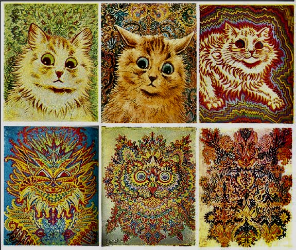I was fascinated by a book in the Hornsey College library on ‘Psychotic Art’. The book included painters like Hieronymus Bosch, as well as works by asylum patients. I don’t recall if Richard Dadd was among them! Bosch wouldn’t now be considered insane, and I wonder if Louis Wain’s series of progressively more electrocuted cats had more to do with what he was being prescribed. But see https://en.wikipedia.org/wiki/Louis_Wain