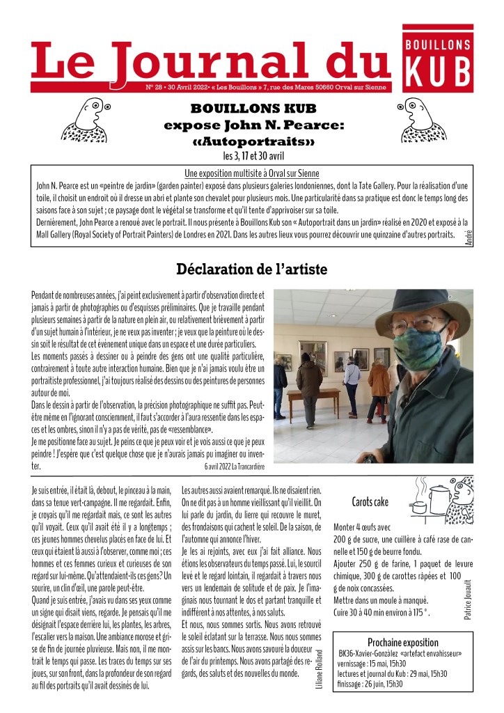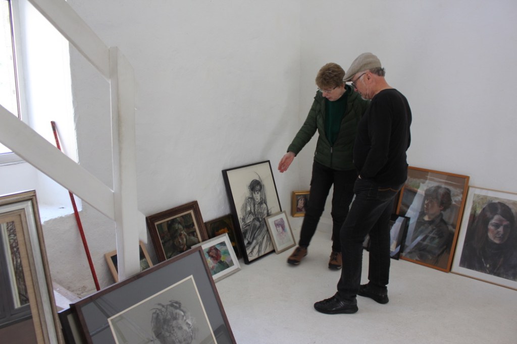 André (aka Marc Gemin) and I have known each other for many years. In February 2022, having got wind of a significant upcoming birthday, he asked if I would consider mounting an exhibition of my portraits and self-portraits at the Kub. I have always made drawings or paintings of people around me and still have many, some from as far back as the 1960s, but portraiture has not been my main profession as an artist, and I rarely accept formal commissions. However, in 2020 I had completed an outdoor self-portrait, which was exhibited in 2021 at the Mall Gallery, London, and this could form the basis of the exhibition.