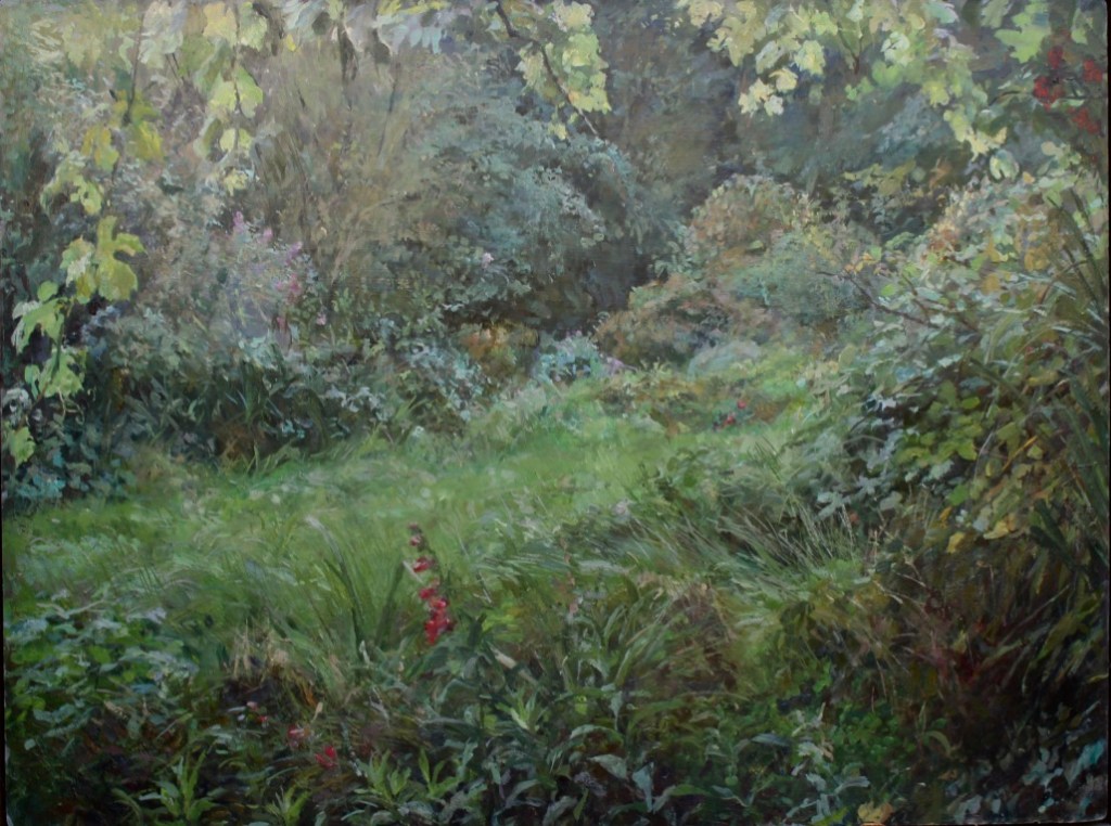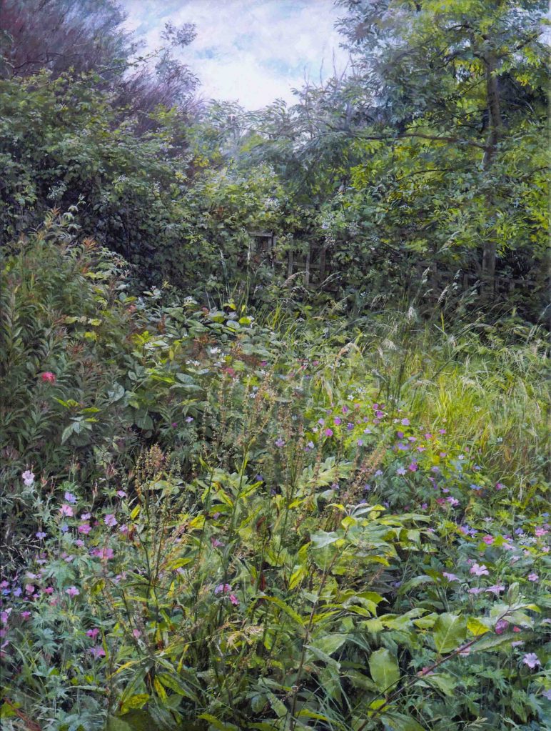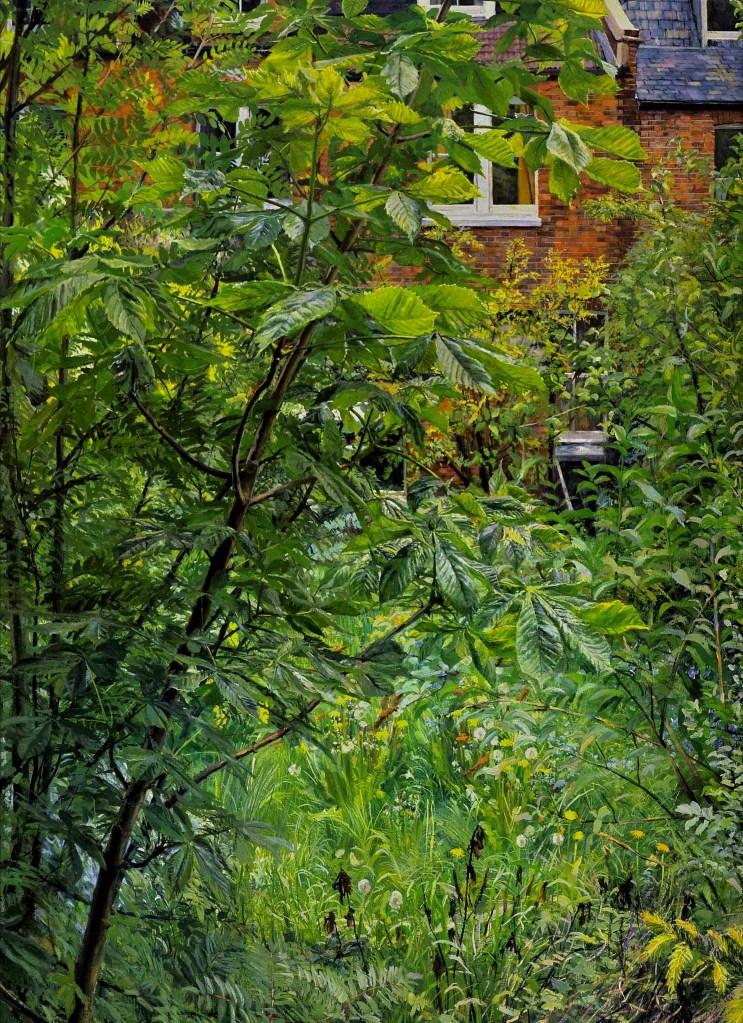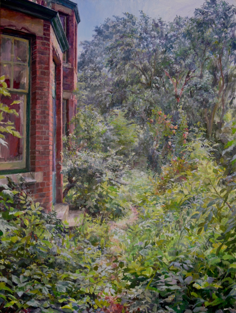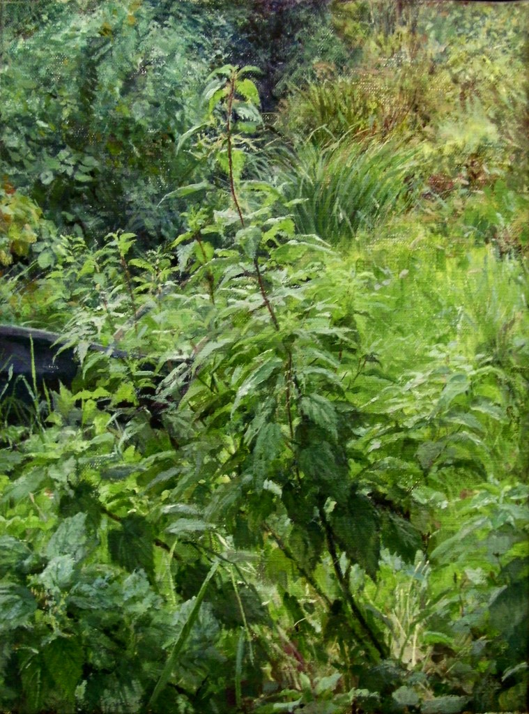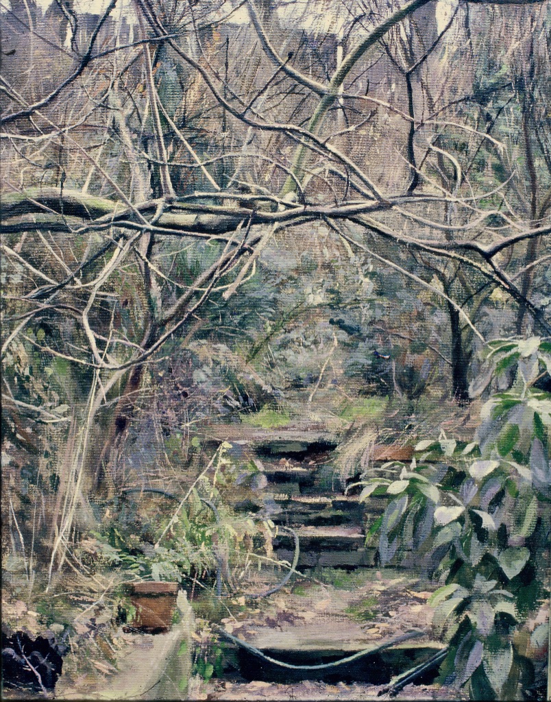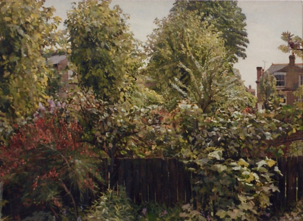 As a city dweller, the wildness of untended corners of urban gardens has attracted me as a source of significant subject matter. All the pictures in the selection below were painted in the gardens of friends, who have been prepared to put up with my presence on their properties, often for months on end, making these works possible.