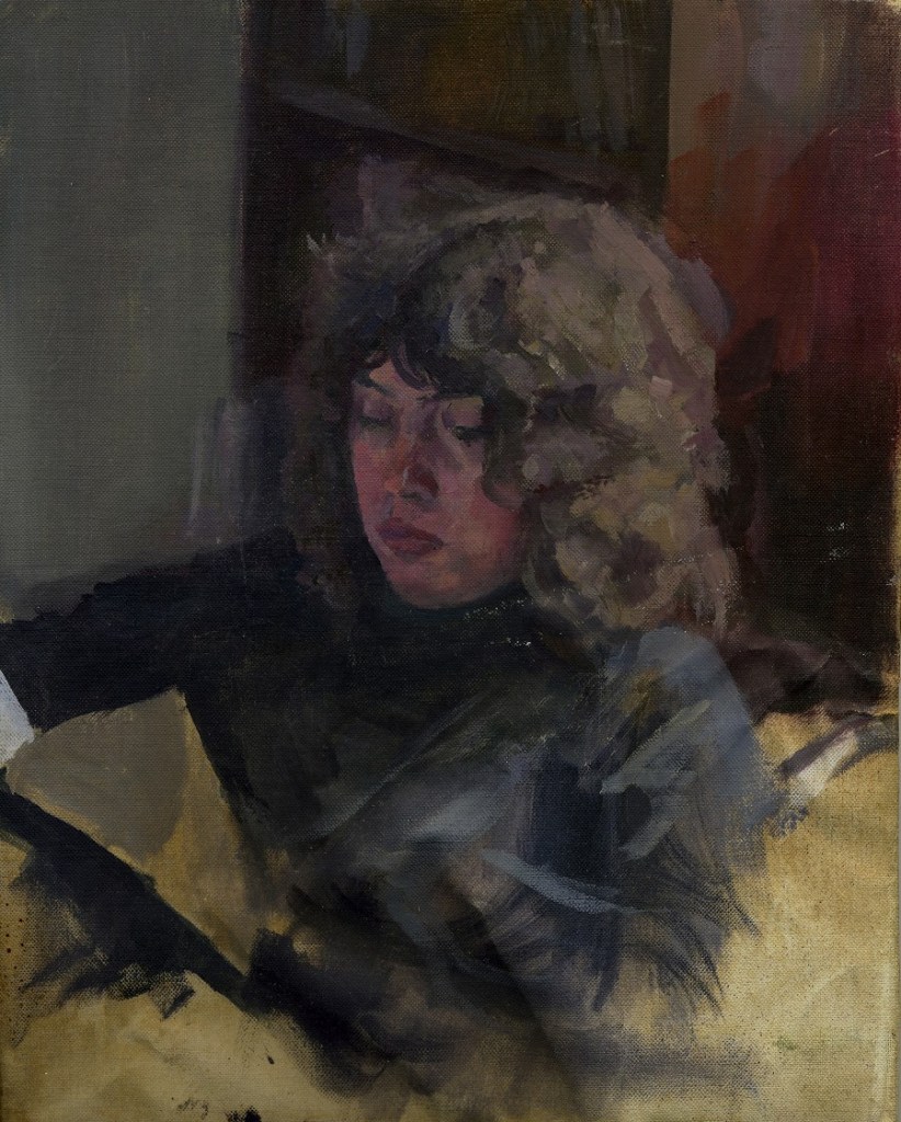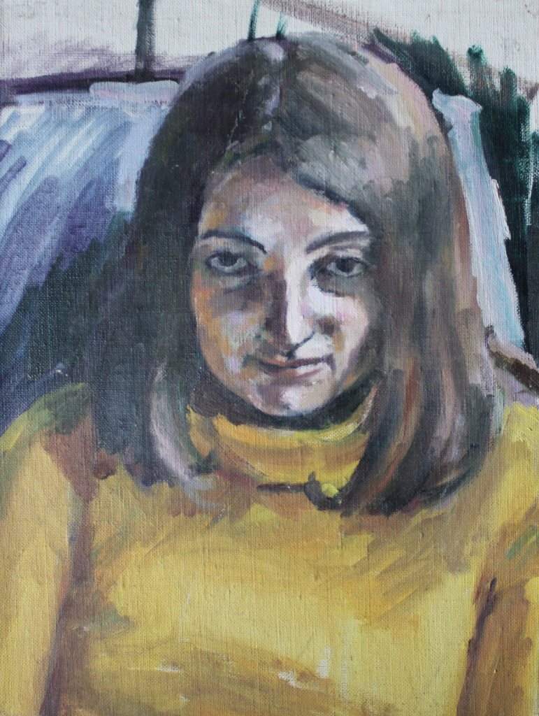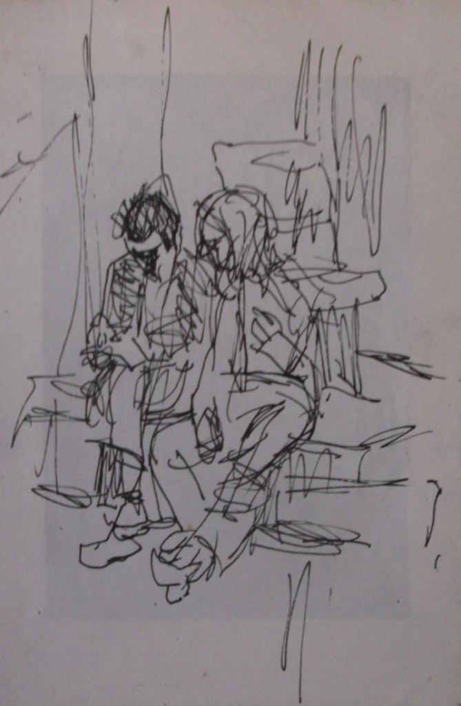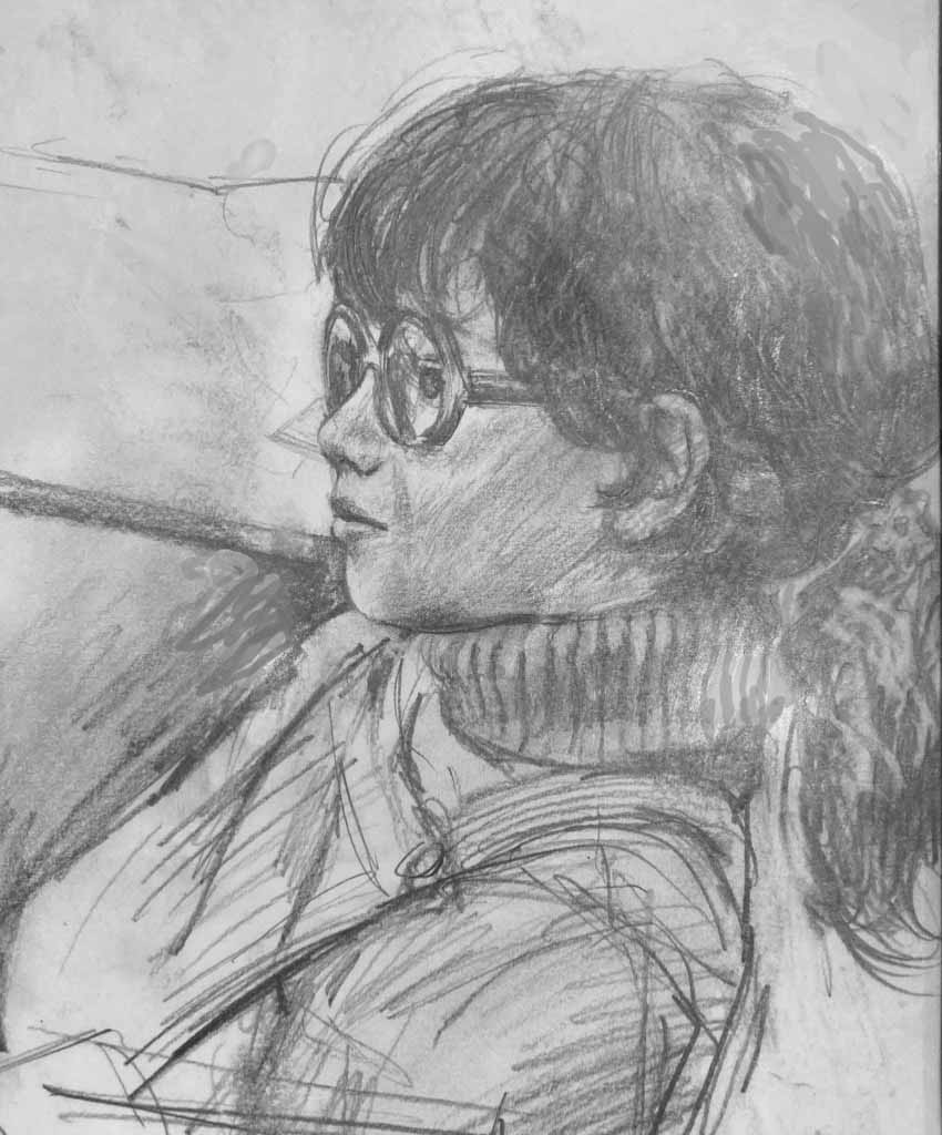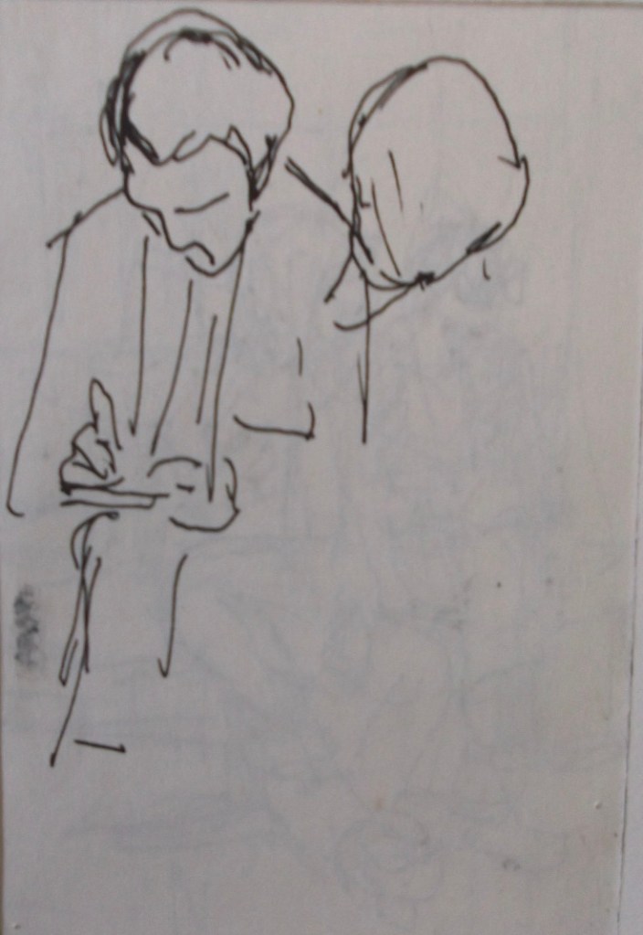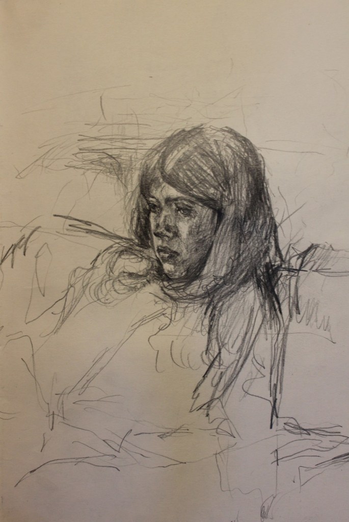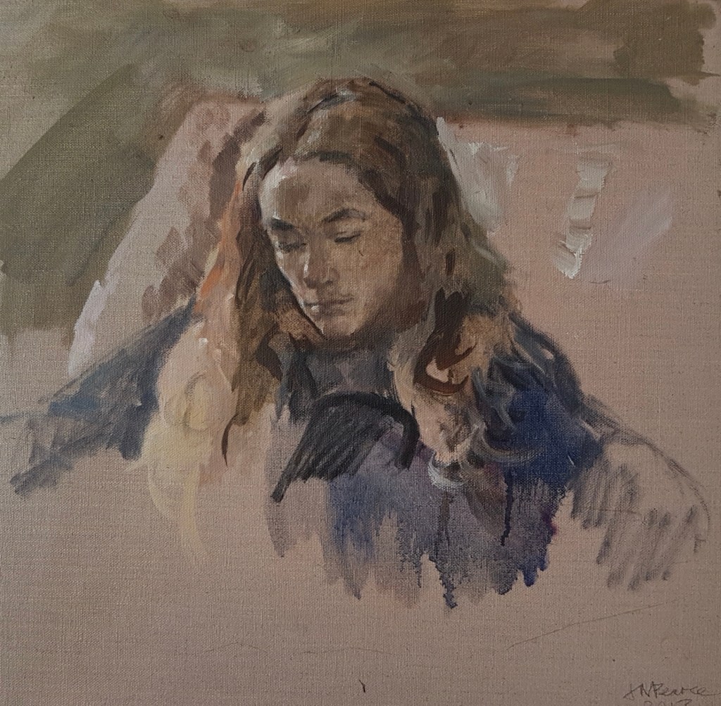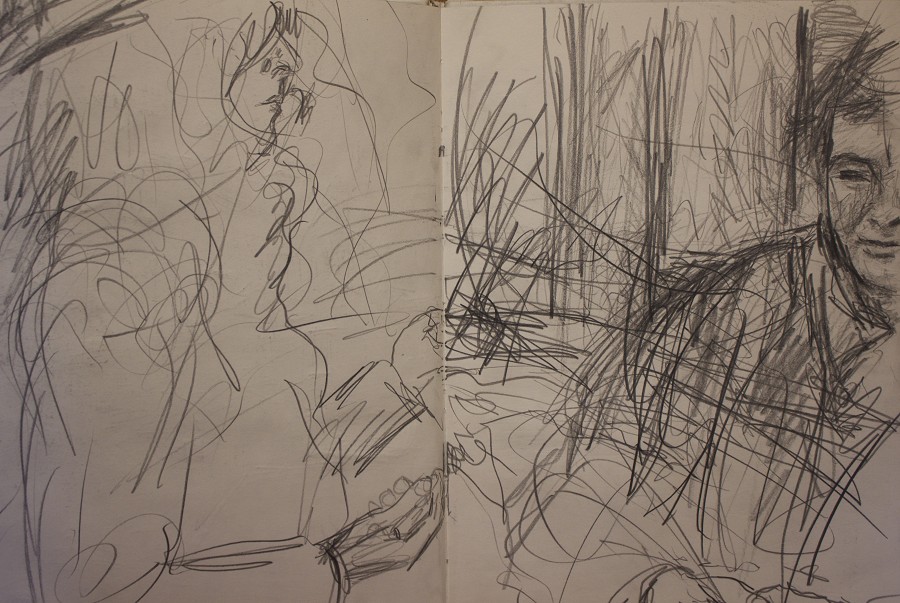 I have always made drawings or paintings of people around me, and this selection is a small fraction of them. As with any other painting or drawing from life, one finds a ‘likeness’, an ‘aura’ or ‘feeling’ unique to the the place, the occasion and the person. It was Julia Auerbach, née Wolstenholme, a tutor at Hornsey Art College in the 1960s, who alerted me to this all-important ‘feeling’ element. Moments spent drawing or painting people have a special quality unlike any other human interaction.
