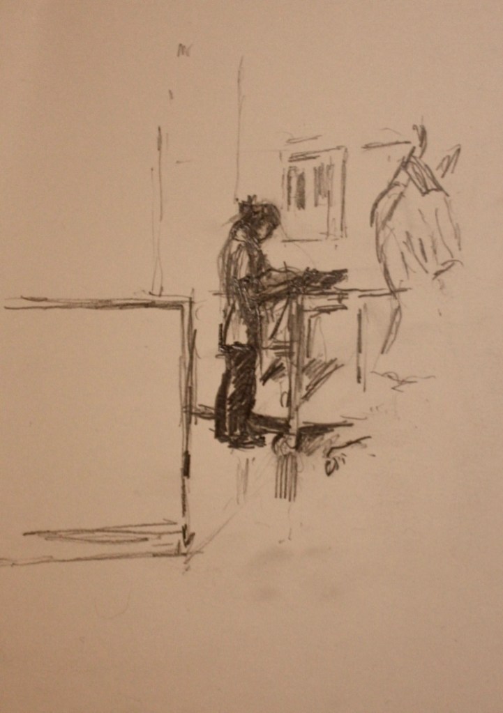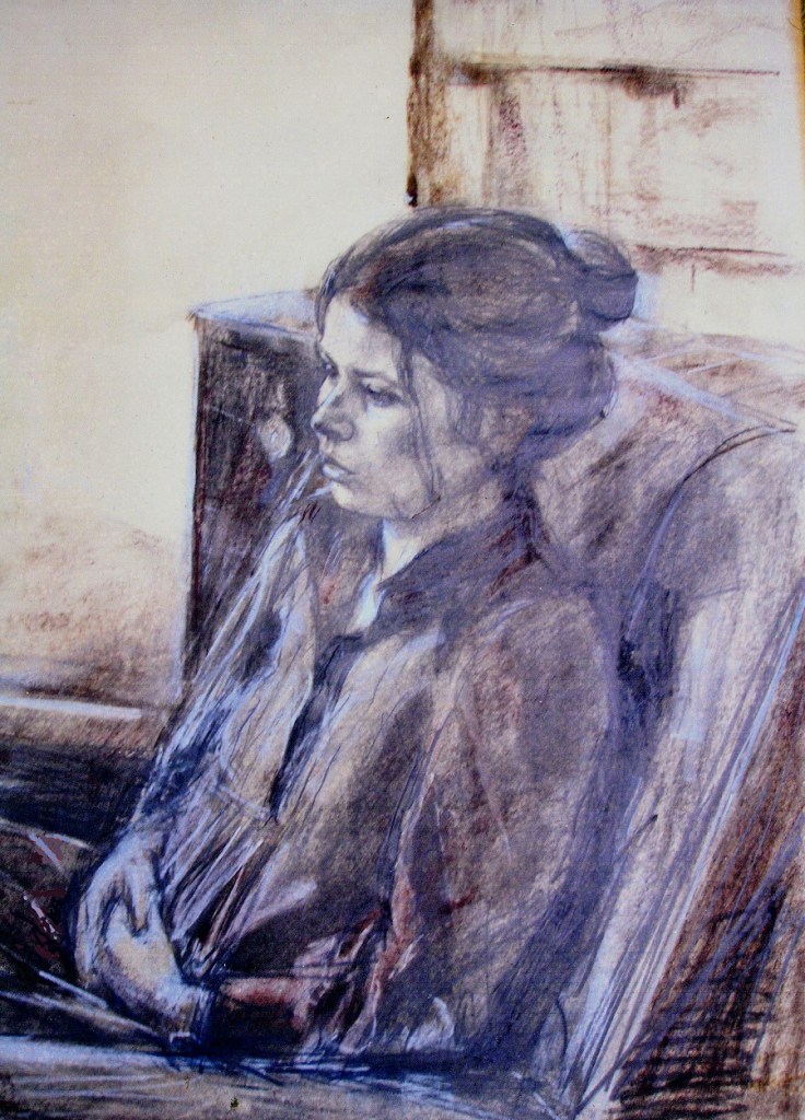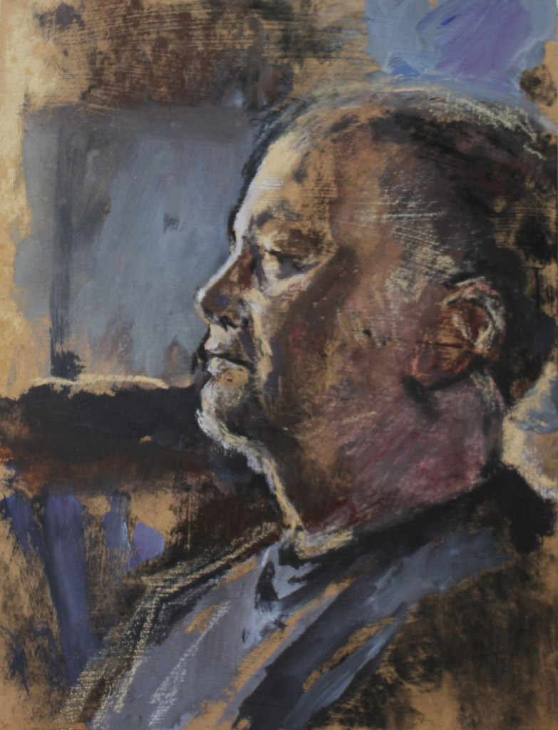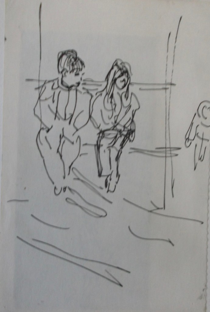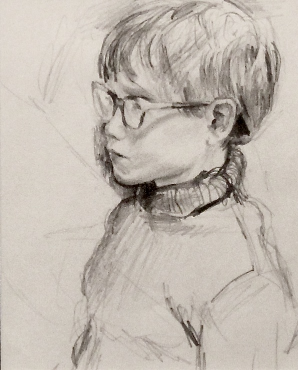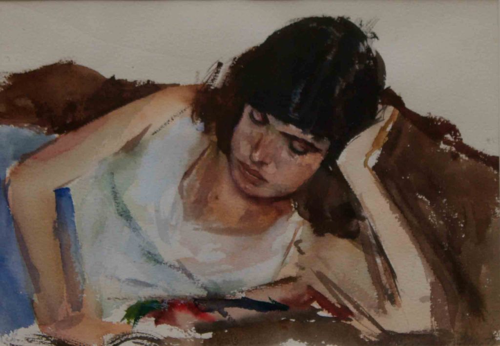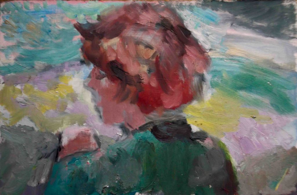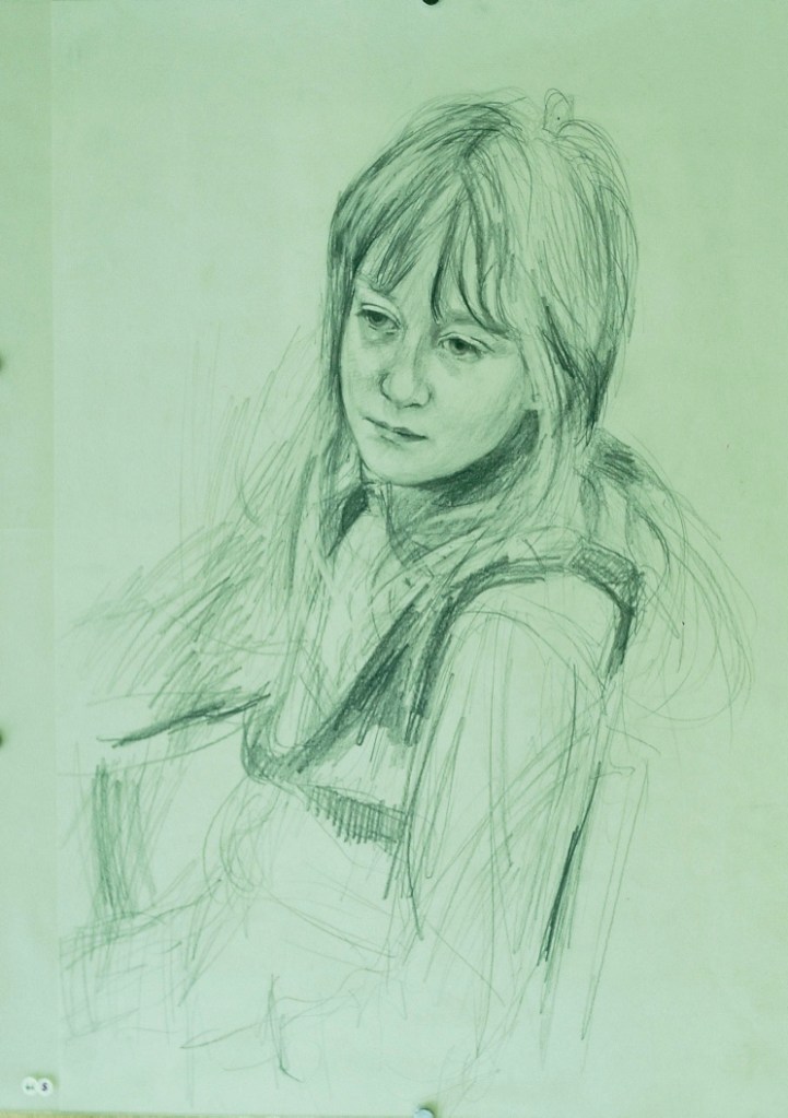 I have always made drawings or paintings of people around me, and this selection is a small fraction of them. As with any other painting or drawing from life, one finds a ‘likeness’, an ‘aura’ or ‘feeling’ unique to the the place, the occasion and the person. It was Julia Auerbach, née Wolstenholme, a tutor at Hornsey Art College in the 1960s, who alerted me to this all-important ‘feeling’ element. Moments spent drawing or painting people have a special quality unlike any other human interaction.