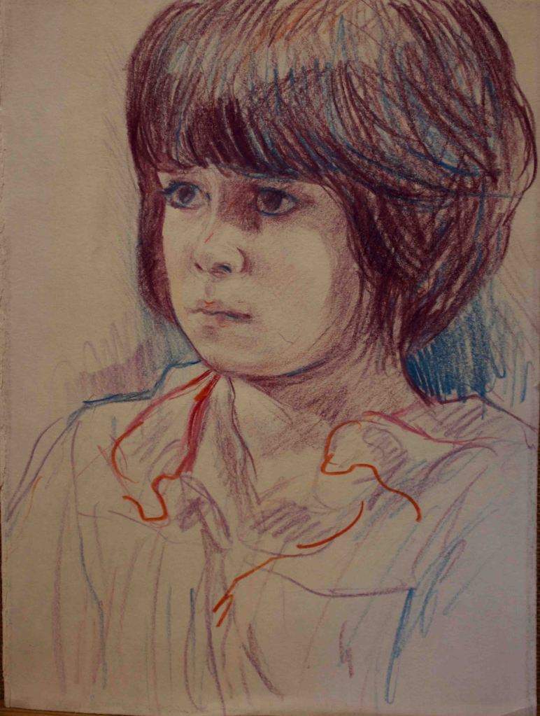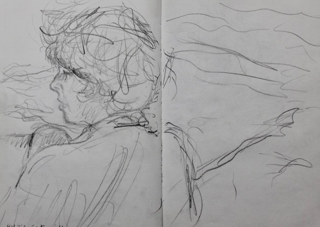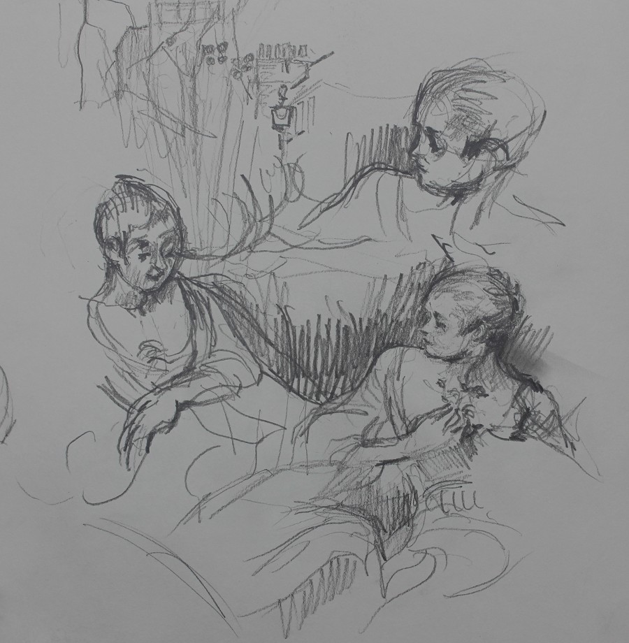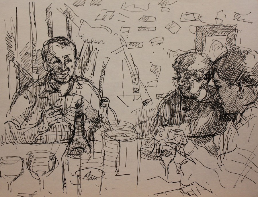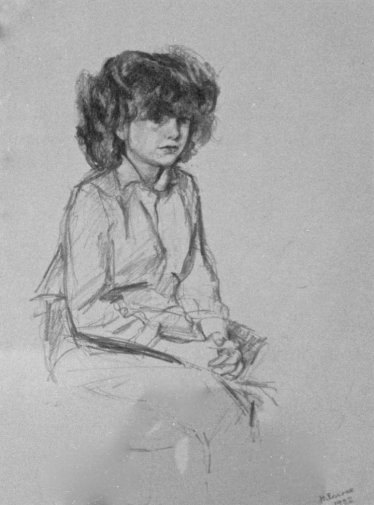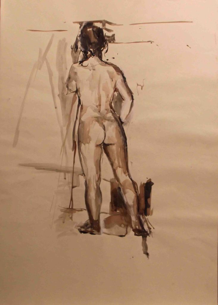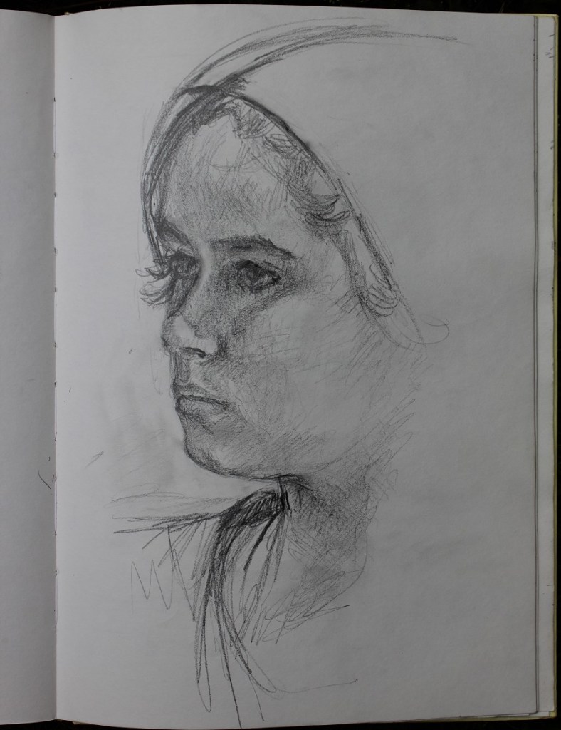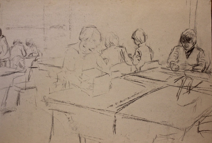 I have always made drawings or paintings of people around me, and this selection is a small fraction of them. As with any other painting or drawing from life, one finds a ‘likeness’, an ‘aura’ or ‘feeling’ unique to the the place, the occasion and the person. It was Julia Auerbach, née Wolstenholme, a tutor at Hornsey Art College in the 1960s, who alerted me to this all-important ‘feeling’ element. Moments spent drawing or painting people have a special quality unlike any other human interaction.