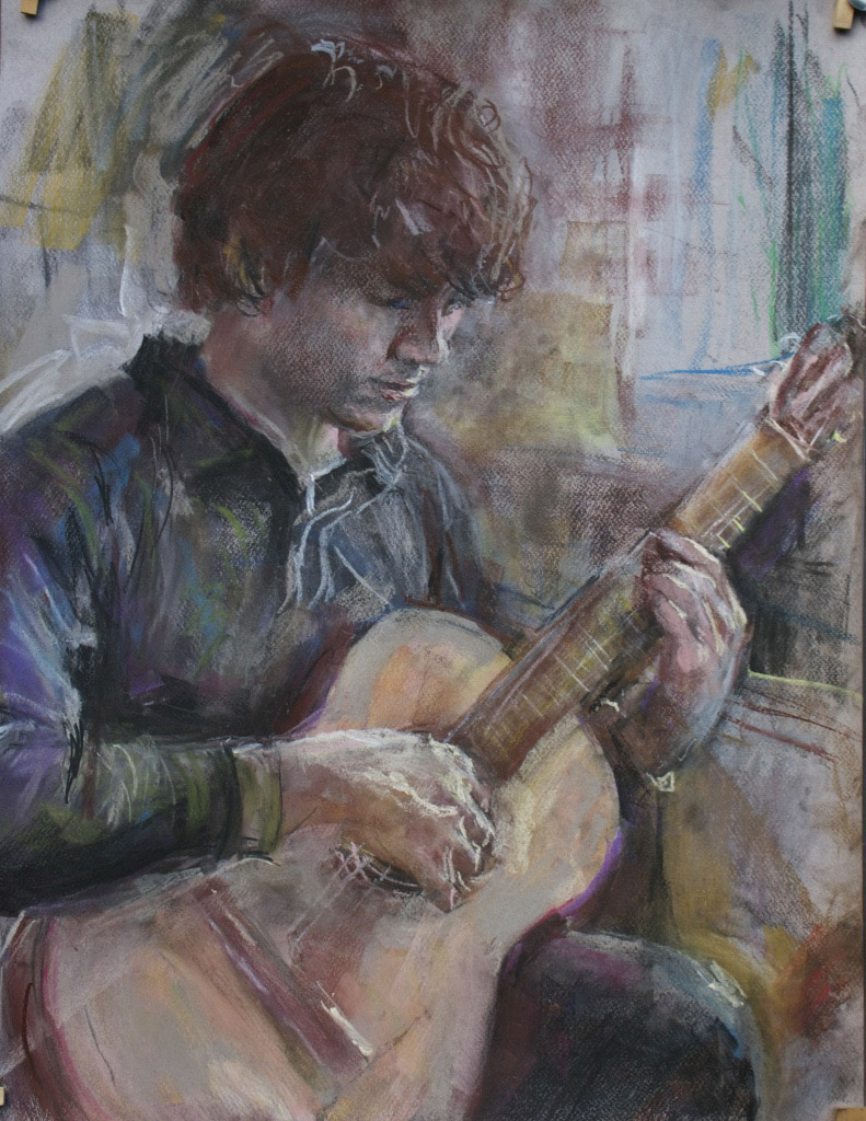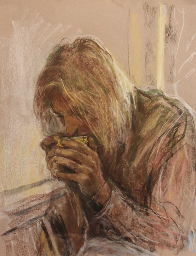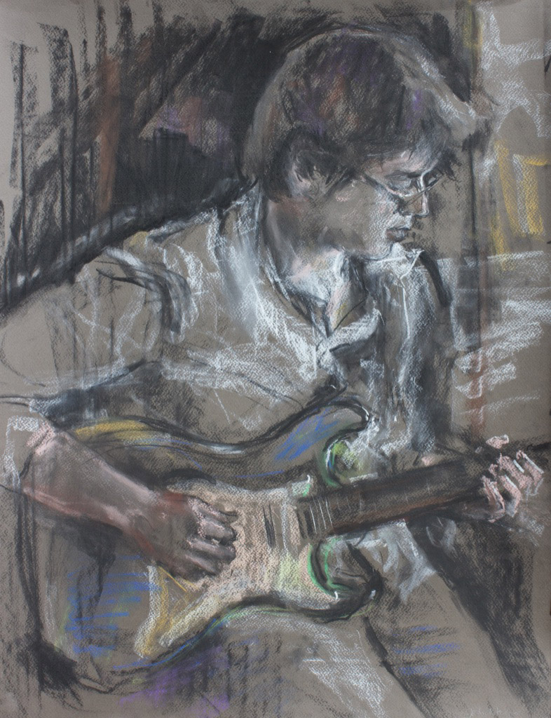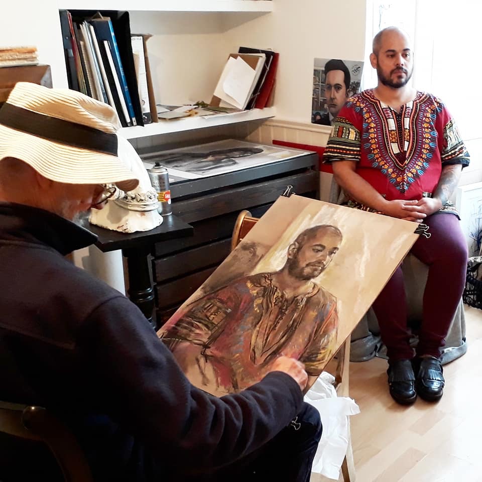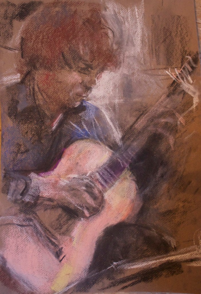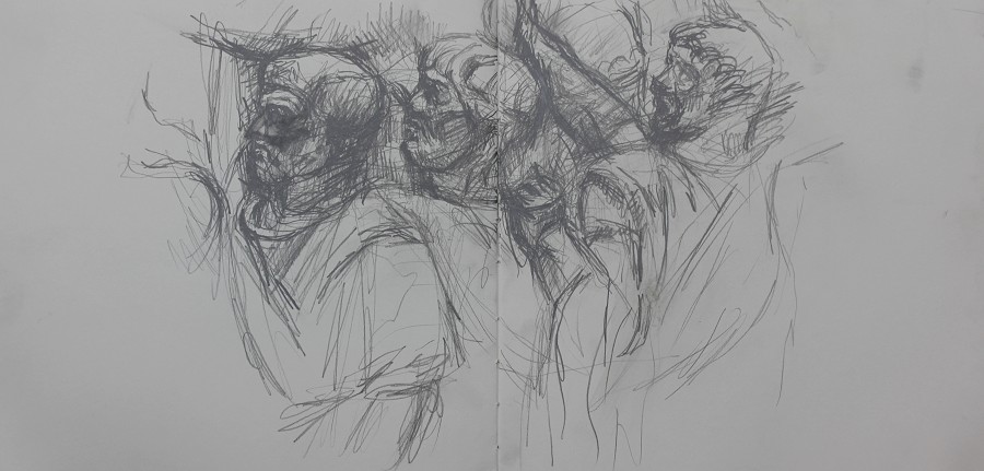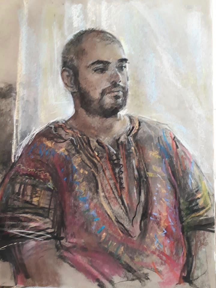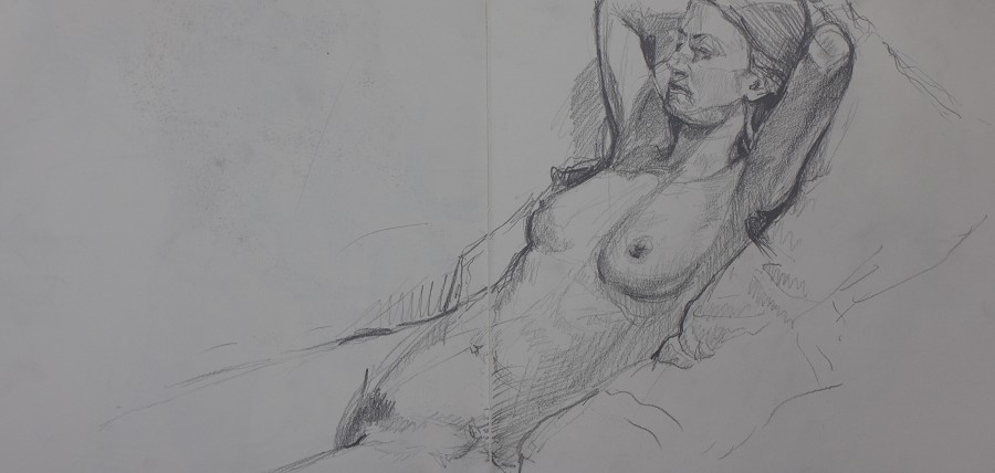 I have always made drawings or paintings of people around me, and this selection is a small fraction of them. As with any other painting or drawing from life, one finds a ‘likeness’, an ‘aura’ or ‘feeling’ unique to the the place, the occasion and the person. It was Julia Auerbach, née Wolstenholme, a tutor at Hornsey Art College in the 1960s, who alerted me to this all-important ‘feeling’ element. Moments spent drawing or painting people have a special quality unlike any other human interaction.